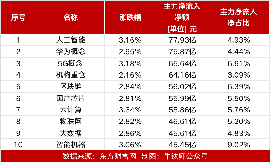 从概念板块来看:今日人工智能、华为概念、5G概念主力资金流入较多,流入净额分别为77.93亿元、75.87亿元和65.64亿元。另外,机构重仓、区块链、国产芯片、云计算、物联网、大数据和智能机器也是主力资金流入较多的概念板块。