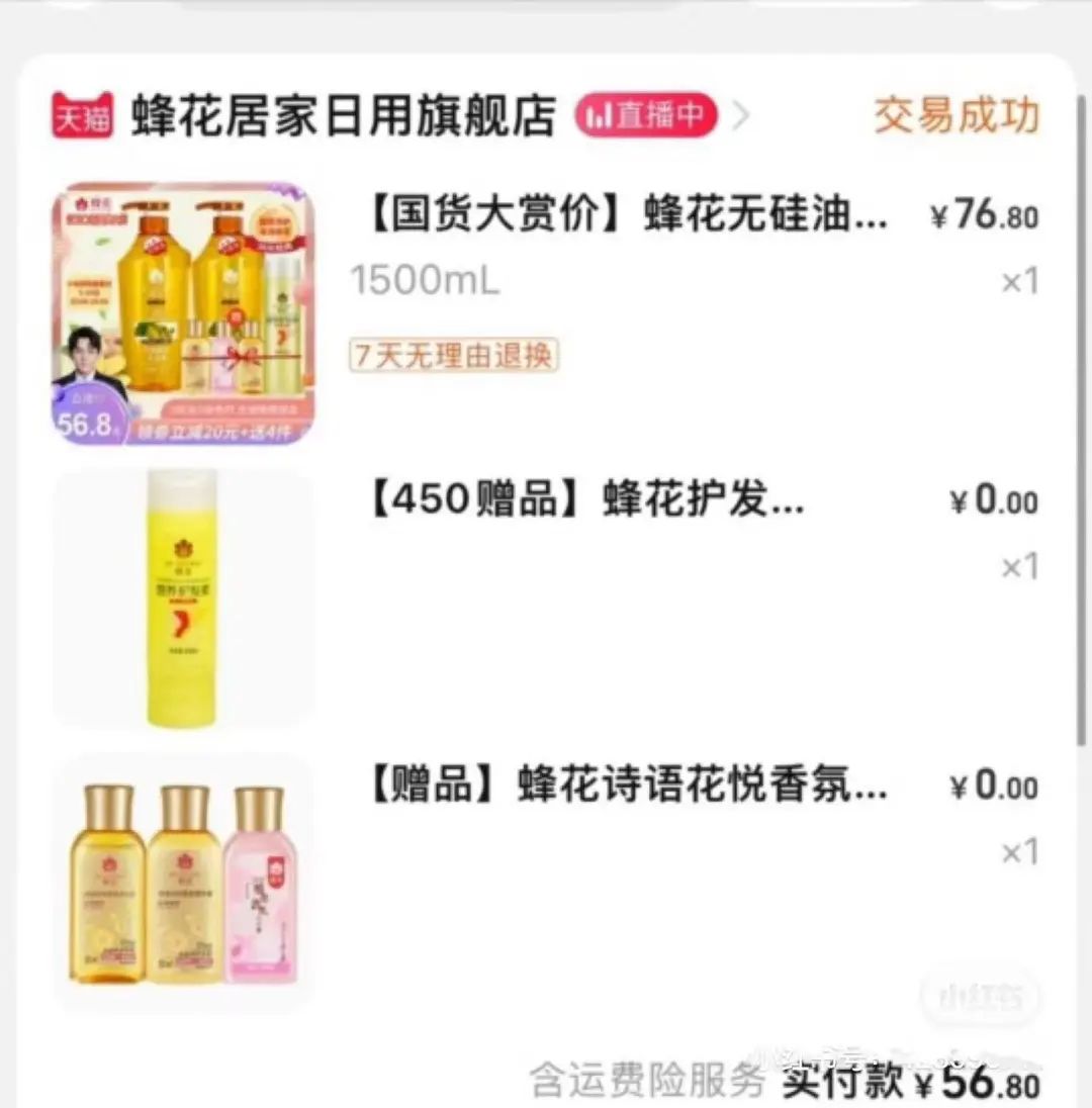 一位网友在小红书展示的购买记录截图显示,最先发起这轮国货狂欢的蜂花,此前也上过李佳琦直播间。