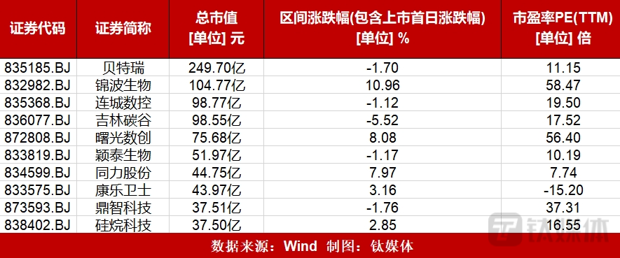 个股方面,北交所市值排名前十的个股涨跌对半, “市值一哥”贝特瑞跌幅1.70%;锦绣波生物涨幅10.96%;连城数控跌幅1.12%;曙光数创涨幅8.08%;颖泰生物跌幅1.16%;同力股份涨幅7.97%;康乐卫士涨3.16%;鼎智科技跌幅1.76%;硅烷科技涨幅2.85%。