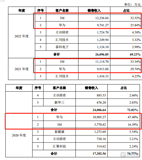 在盛凌电子的前五大客户中有不少知名客户,如华为、3M、立讯精密,特别是3M和华为始终霸占着公司前两大客户。