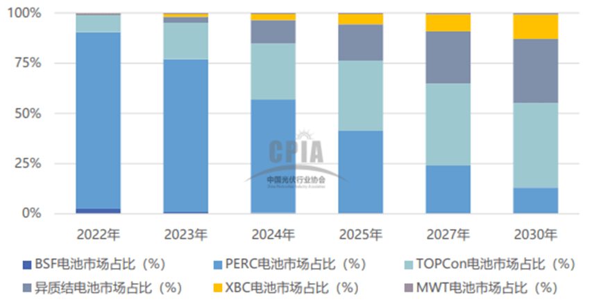 2022年-2030年不同电池技术路线市场占比变化趋势 来源:CPIA