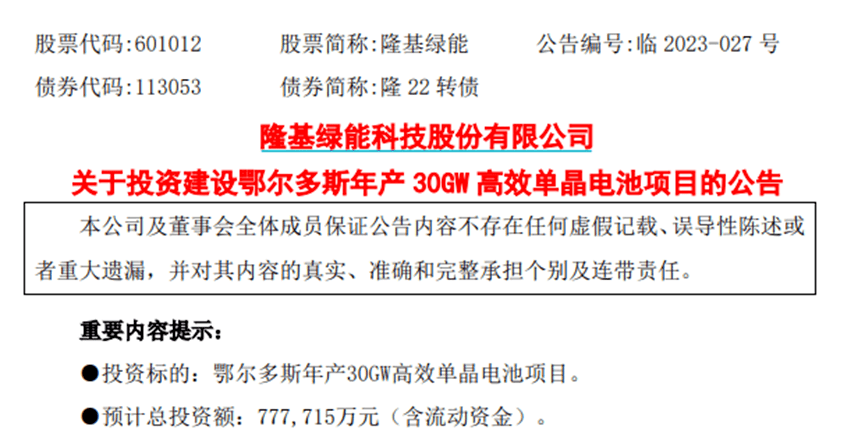 隆基发布30GWTOPCon电池投建项目计划 来源:隆基绿能公告