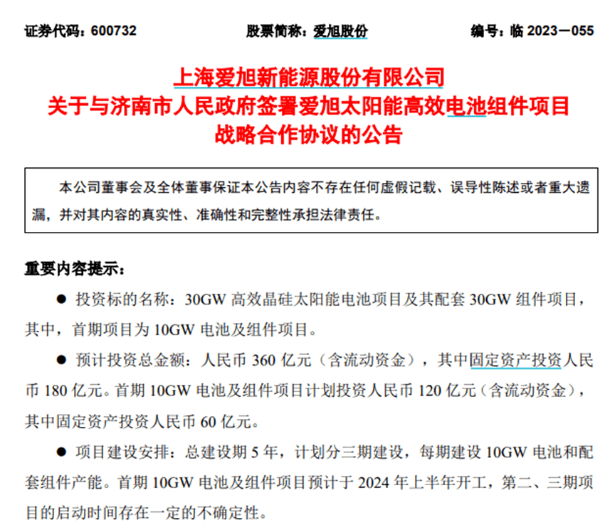 爱旭股份公布与济南市合作360亿光伏电池投资项目 来源:爱旭股份公告
