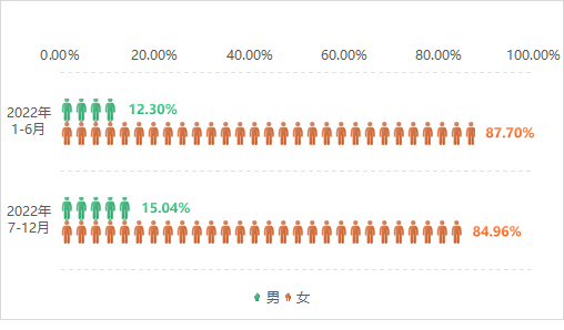 2022年上半年Vs下半年社交平台脱毛话题用户性别分布(男性环比增长25.2%)数据来源:魔镜市场情报
