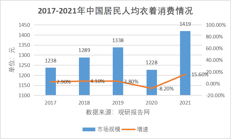 同样增长的还有人均消费额度。虽然2020年该数据历经波折降至1228元,但2021年数据同样历经反转,快速提升至1419元,五年内复合增长率3.47%,斜率与市场规模增速维持一致。