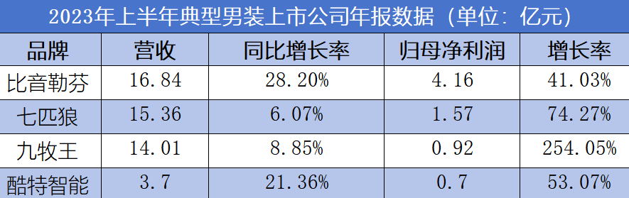 其他男装品牌没有更高的份额,不过在整体向上的背景下,普遍表现出业绩快速增长趋势。汇总代表性男装上市公司上半年业绩,营收与归母净利润双增,且后者增幅大于前者的企业不在少数。其中有2022年基数低的原因,不过市场蛋糕之大、机会之多,还是肉眼可见。