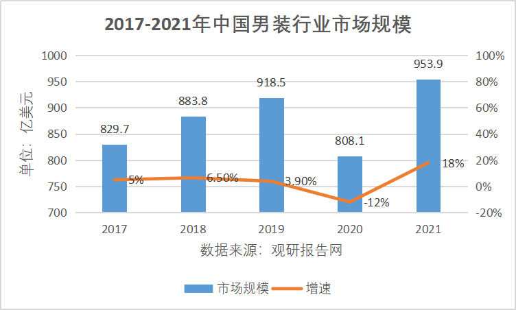 虽然受到疫情影响,2020年行业规模大幅缩减12%,但2021年男装消费市场快速回升至953.9亿美元,线下卖场和线上网店,共同造就了18%的增长,五年内复合增长率3.55%,甚至在新冠疫情影响仍在情况下,依然造就了一个显著的V型曲线。