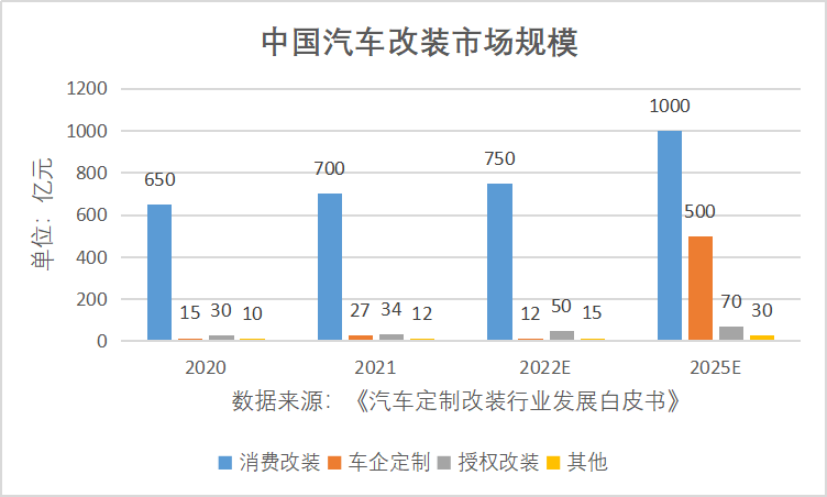 据美国汽车改装行业组织SEMA(Specialty Equipment Market Association)统计,2021年美国汽车改装市场规模突破500亿美元,预计2025年将超过580亿美元;相比之下,2022年中国汽车改装市场仅为935亿元(汽车合规改装联合推进办公室数据),提升空间无可限量。