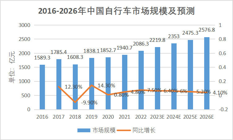 随着不同业态的形成,自行车市场规模还会不断增长。中国自行车协会预计,2022-2026年整个市场将维持5.42%的年复合增长率。