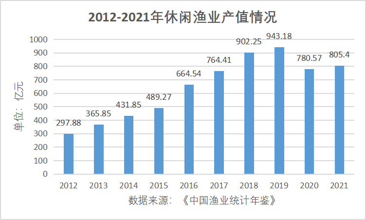 正是这些男性消费的出现,推动垂钓行业维持增长趋势。《中国渔业统计年鉴》数据显示,2012-2019年休闲渔业产值始终维持增长态势。虽然受到疫情影响2020年产值有所下降,但是2021年随即恢复向上增长趋势,超过2017年同期水平。