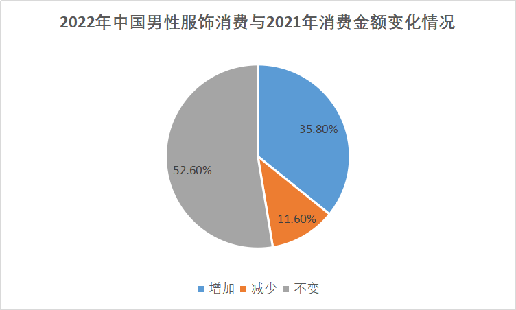2022年仍在执行疫情防控措施,一定程度影响实体店正常经营,不过在线下业务的支撑下,男装消费仍然具备增长动能。根据艾媒咨询发布数据,2022年仅有11.6%男性消费者服装开销低于2021年,其中52.6%维持不变,剩下的35.8%还有一定额度的增长。