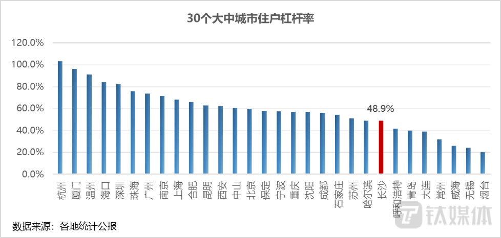 根据公开数据,采用住户贷款余额与名义GDP之比的算法,对30个大中城市的住户杠杆率进行了测算。结果显示,住户杠杆率最高的城市是杭州,长沙以48.9%的住户杠杆率排名第23,比杭州低54.3%,低于全国平均住户部门杠杆率11.5个百分点。