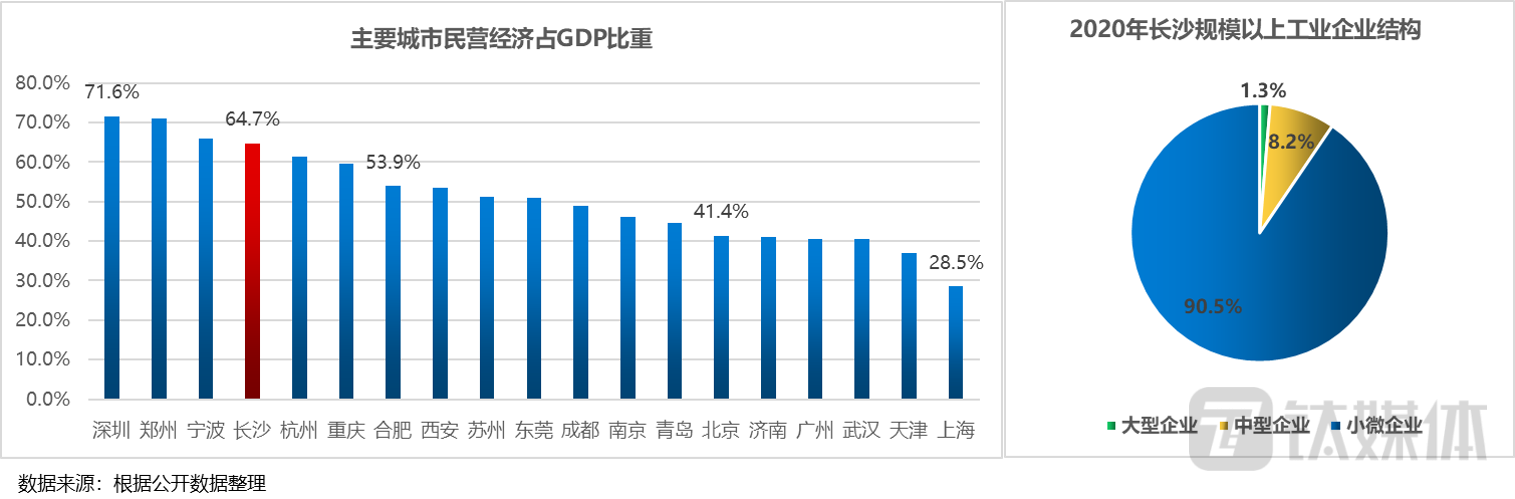2021年,长沙GDP超过1.3万亿,民营经济增加值8579.89亿,贡献了64.7%的GDP, 58%以上的税,50%以上的高新技术产值,满足了65%以上的“四上”企业就业人员就业。民营经济占比超过杭州等地,位居全国第4位。