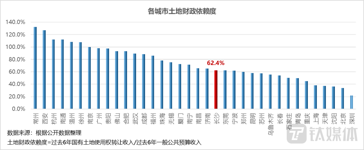 土地财政依赖度较低:2017-2022年,长沙平均土地财政依赖度为62.4%,在36个一、二线城市中排名第21。