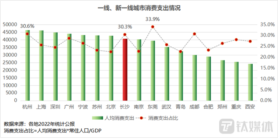 可控的房价预期,加上房价收入比低,剔除房贷后,居民可用余钱较多,人民的获得感、幸福感强,也促进了消费活力的释放。2023年上半年长沙居民人均生活消费支出19344元,同比增长4.0%;以食品烟酒支出为主,单项占比达26%。在一线、新一线城市中,长沙人均消费支出排第8名,消费支出占比达30.3%,位居第三。