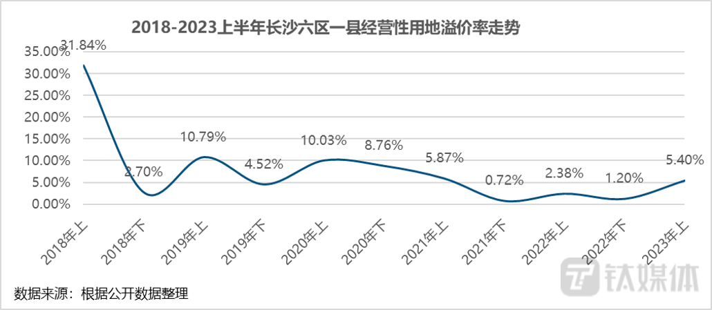 长沙严格限制土地成交溢价率,2018下半年以来,整体经营性用地溢价率维持低位。