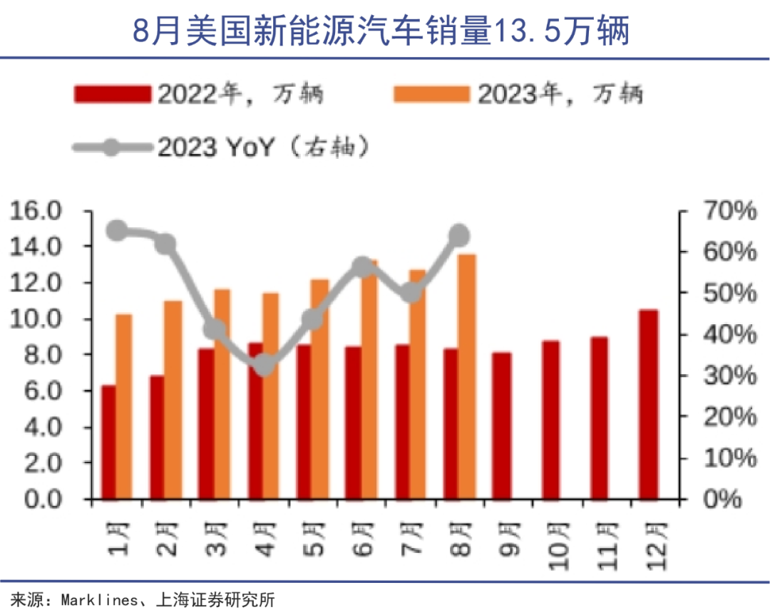 2022年,美国新能源汽车销量为92万辆,同比增长72%,市场容量仅次于中国和欧洲。不过,其新能源汽车渗透率才有7%。到今年前八月,美国市场卖出了95.6万辆新能源汽车,同比增长51%,渗透率提升到 10.1%。