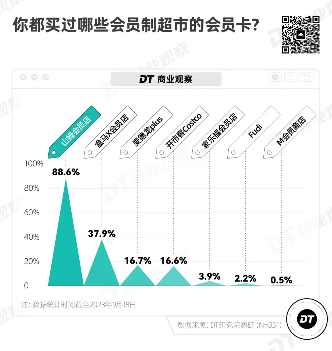 从这个数据来看,山姆作为深耕中国市场多年的老品牌,在竞争中持很大优势,而盒马也稳居第二的位置,较其他会员店更受欢迎。