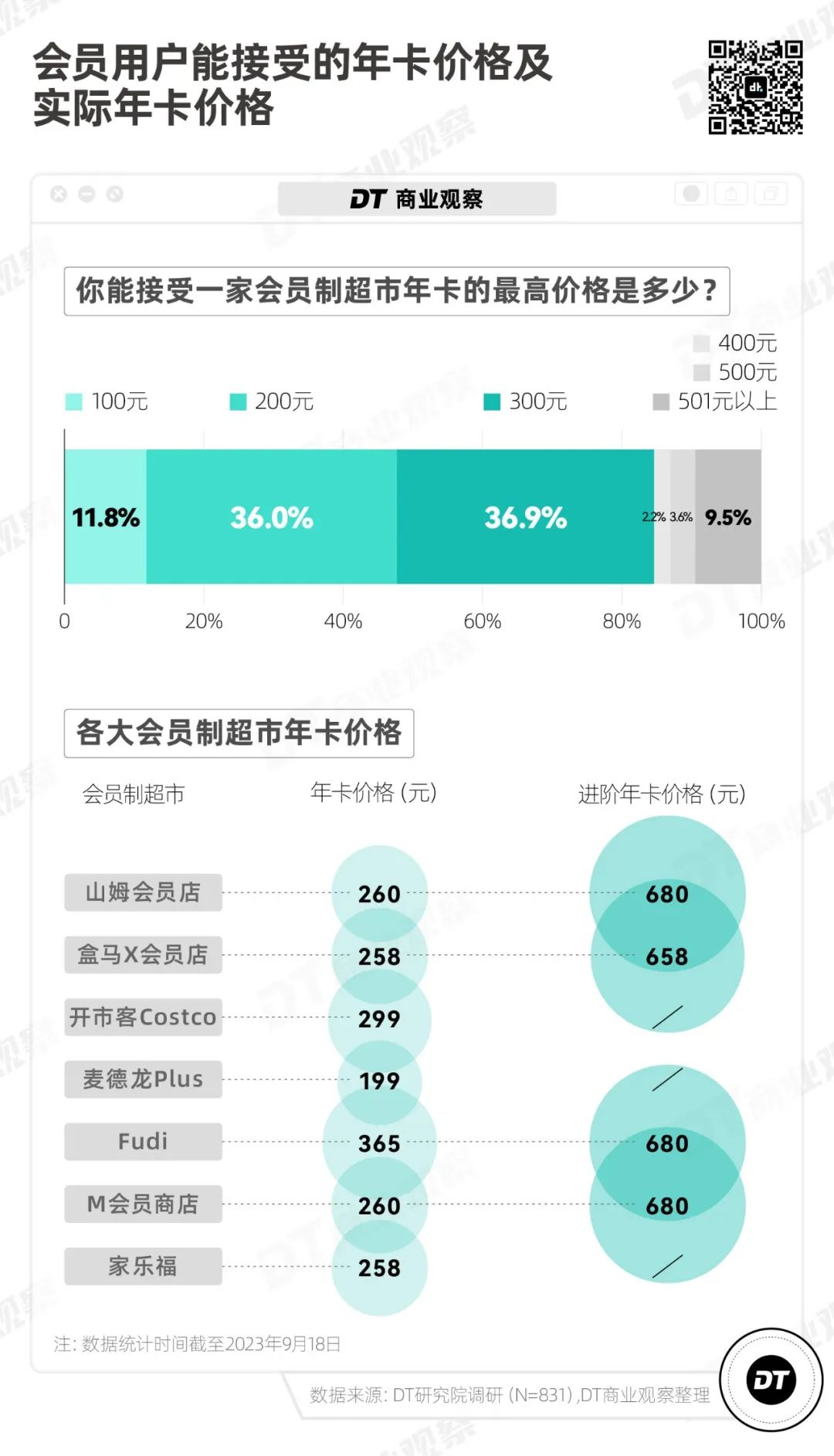 调研数据显示,36.9%的会员能接受的最高价格是300元,这对应了大部分会员制超市的年卡价格。47.8%的会员用户能接受的年卡价格在200元以下,他们或许通过拼卡等方式便宜入会。
