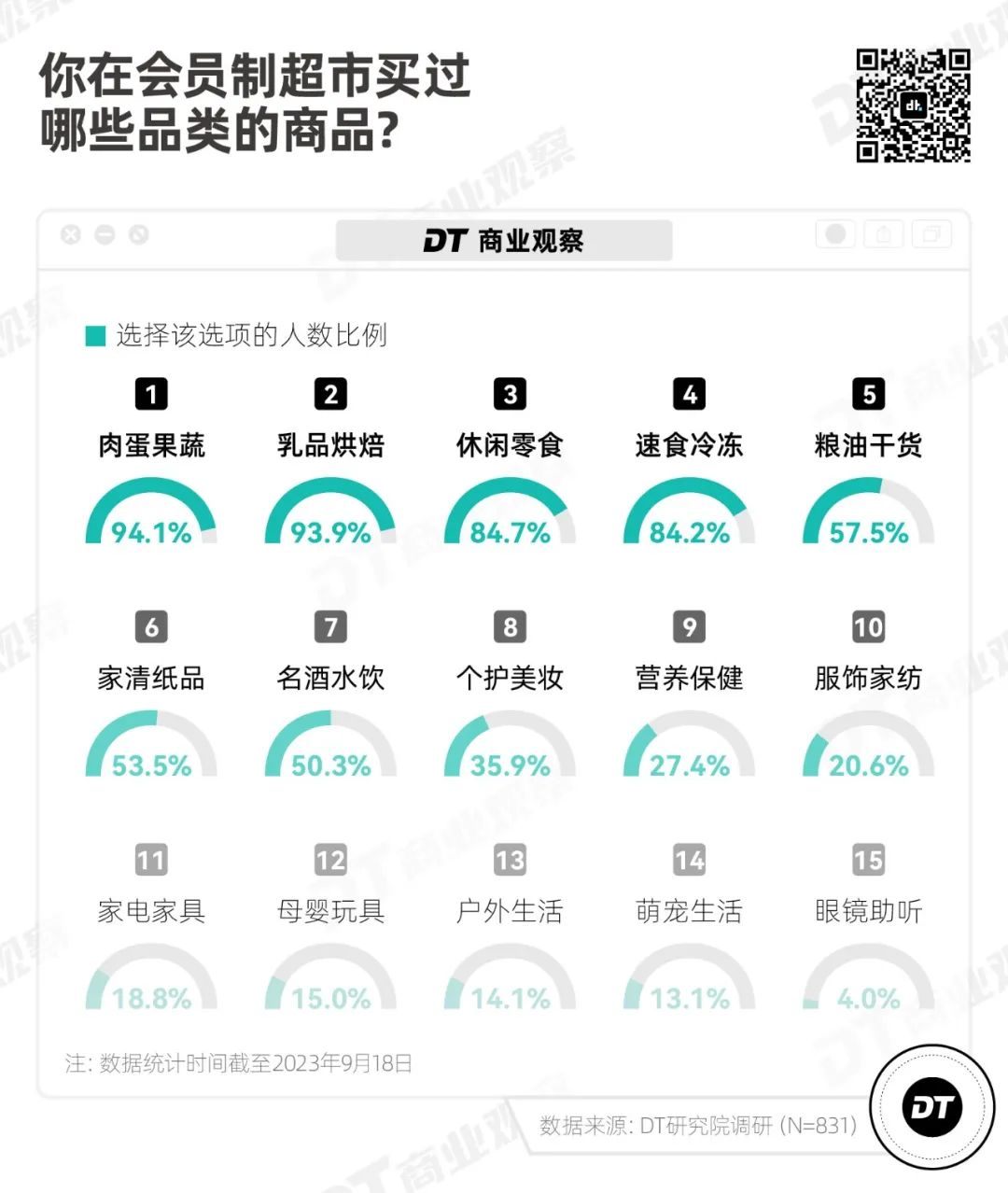 超9成参与调研的人,都在会员制超市买过肉蛋果蔬、乳品烘焙等产品,其次是休闲零食、速食冷冻,购买过的人数比例接近85%。