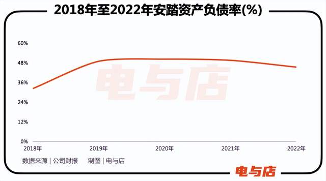 此后,安踏的资产负债率一直居高不下。2020年至2022年,安踏的资产负债率分别为50.21%、49.48%、45.32%。对比之下,过去三年,李宁的资产负债率分别为40.46%、30.29%、27.68%。
