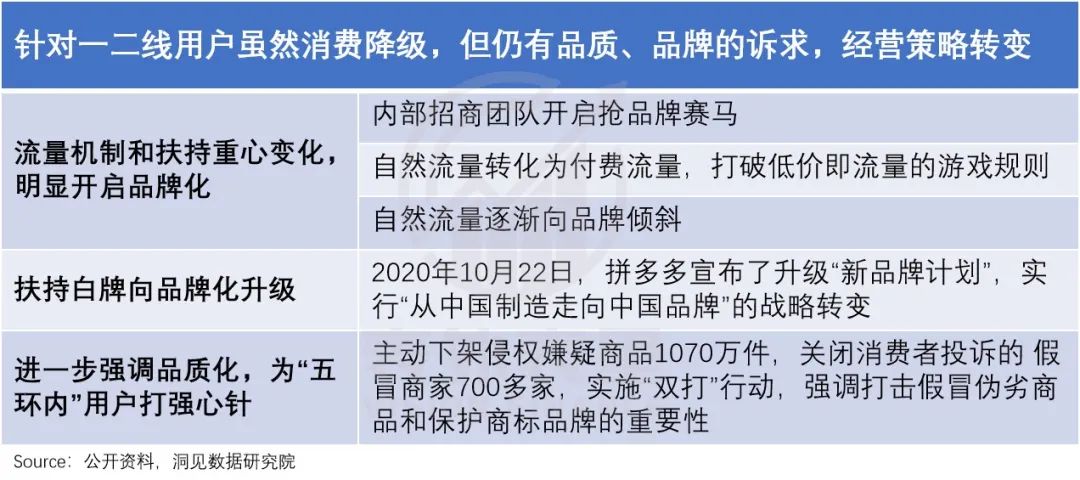 回到拼多多,可以看到,2020年以来,其为了从五环外往里走,费尽心思讨好一二线消费群体。
