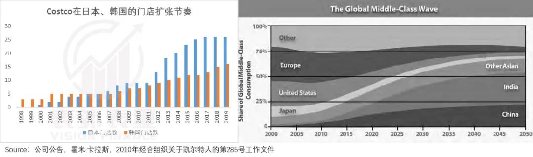 可以看到,Costco进入日本、韩国、中国大陆的时间,刚好和每个地区中产崛起的时间段一致。