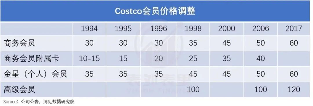 1994-2006年Costco会员涨价6次,个人会员从35美元涨到50美元;而2006年后至今,仅2017年涨价一次。