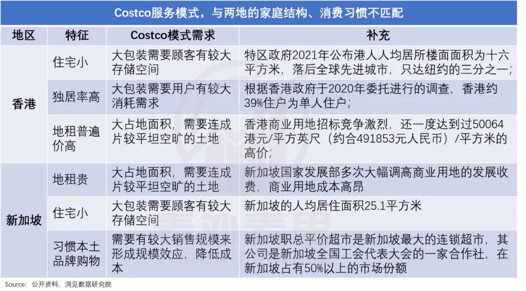 以香港为例,高昂房价下,50平就算豪宅了,缺乏存储大包装、大批量商品的空间;同时,比起北美的大家庭制,其中产阶层小家庭为多,难以消化大商品规格。