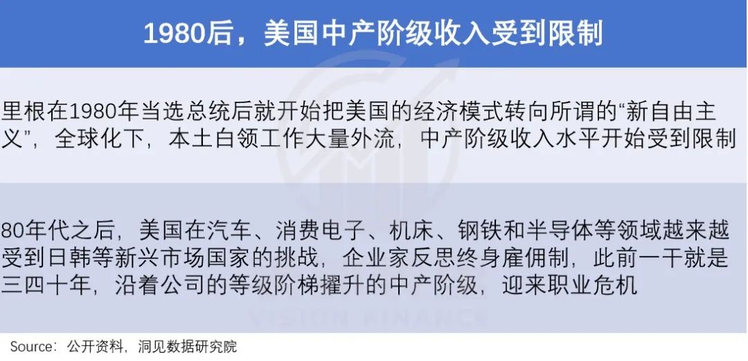 1980年代之后,里根“新自由主义”盛行,美国本土白领工作大量外流,跃升通道逐渐狭窄,中产收入水平缩水。