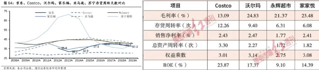 更进一步,得益于庞大的销售量,Costco的库存周转、ROE水平都优于零售同行。比如,2008-2019年间,库存周转天数保持在27天左右,远低于沃尔玛、家乐福等。