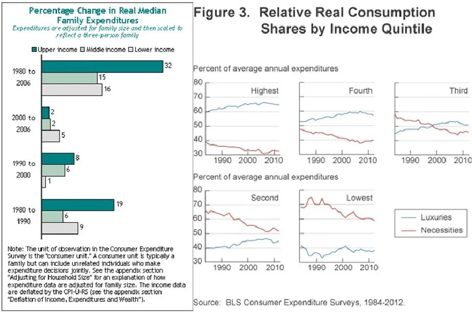 而与之相反,同期普通平民阶层的收入与消费,却开始抬头。可以看到,2006年美国家庭收入的中位数增速,明显快于平均收入增速。