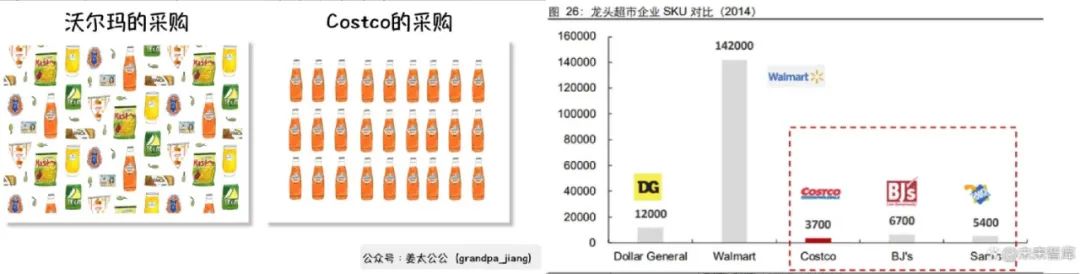 此外,各家商超都逛过的人不难发现,相比沃尔玛、家乐福琳琅满目的货架,Costco每个品类的SKU通常不超过三个。