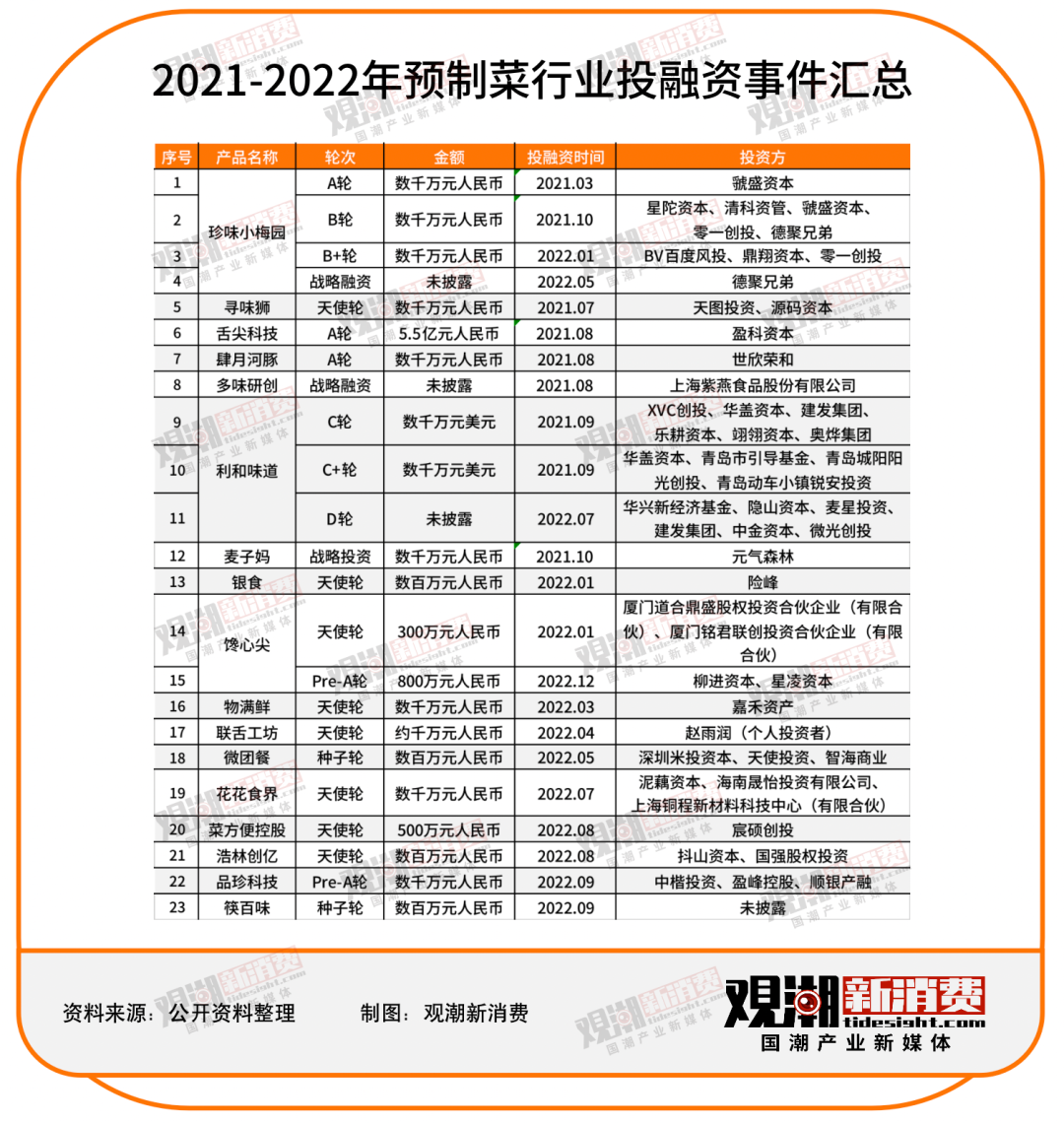 2021年和2022年,预制菜市场共发生23起融资事件,其中有13起融资金额超千万元,深受资本市场青睐。