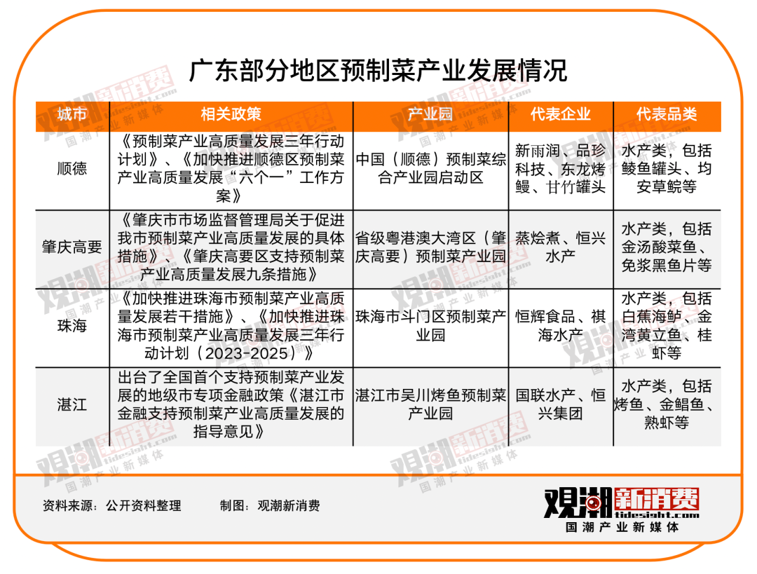 从各地区来看,顺德、肇庆高要、珠海、湛江、惠州、东莞等地纷纷出台政策,大力支持预制菜发展。肇庆高要2022年生产总值542亿元,其中预制菜产业规上企业产值达57亿元。接下来,高要将会通过设立产业基金、引进补贴、政策扶持等形式,继续推动预制菜产业园建设,加快建成“虾、米、猪、羊、桂”五条全产业链,加强技术研发,建设区域品牌。