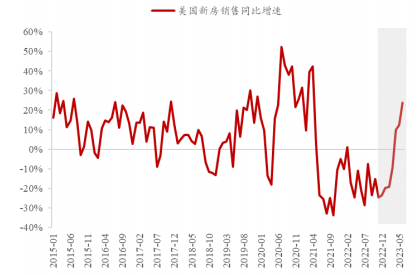 但美国地产股一改历史上加息周期的萎靡表现。虽然美国加息还未结束且加息结束的信号也并不明显,但新房销售却从2022年年底开始出现了大幅反弹,比如今年6 月,美国新房销售同比增速23.8%。