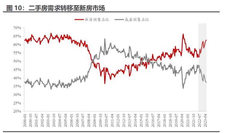 2、二手房交易向新房转移。疫情时美联储降息大放水,很多人以很低的按揭贷款利率买房,而在如今高房贷利率时,居民普遍不愿意卖二手房。逻辑在于,美国很多二手房销售目的是卖旧买新的房屋置换,而居民显然此时不愿承接现有高利率。存量房不卖,刚需转移到新房。
