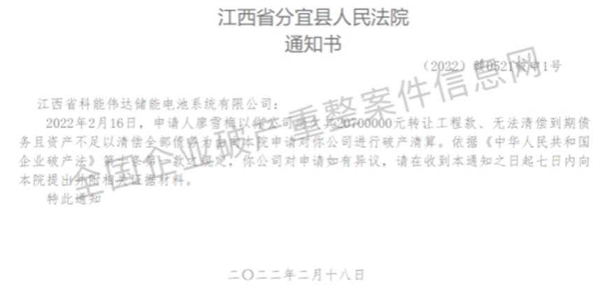 2022年3月,江西省科能伟达储能电池系统有限公司因欠工程款2070万无法偿还,进行破产清算。