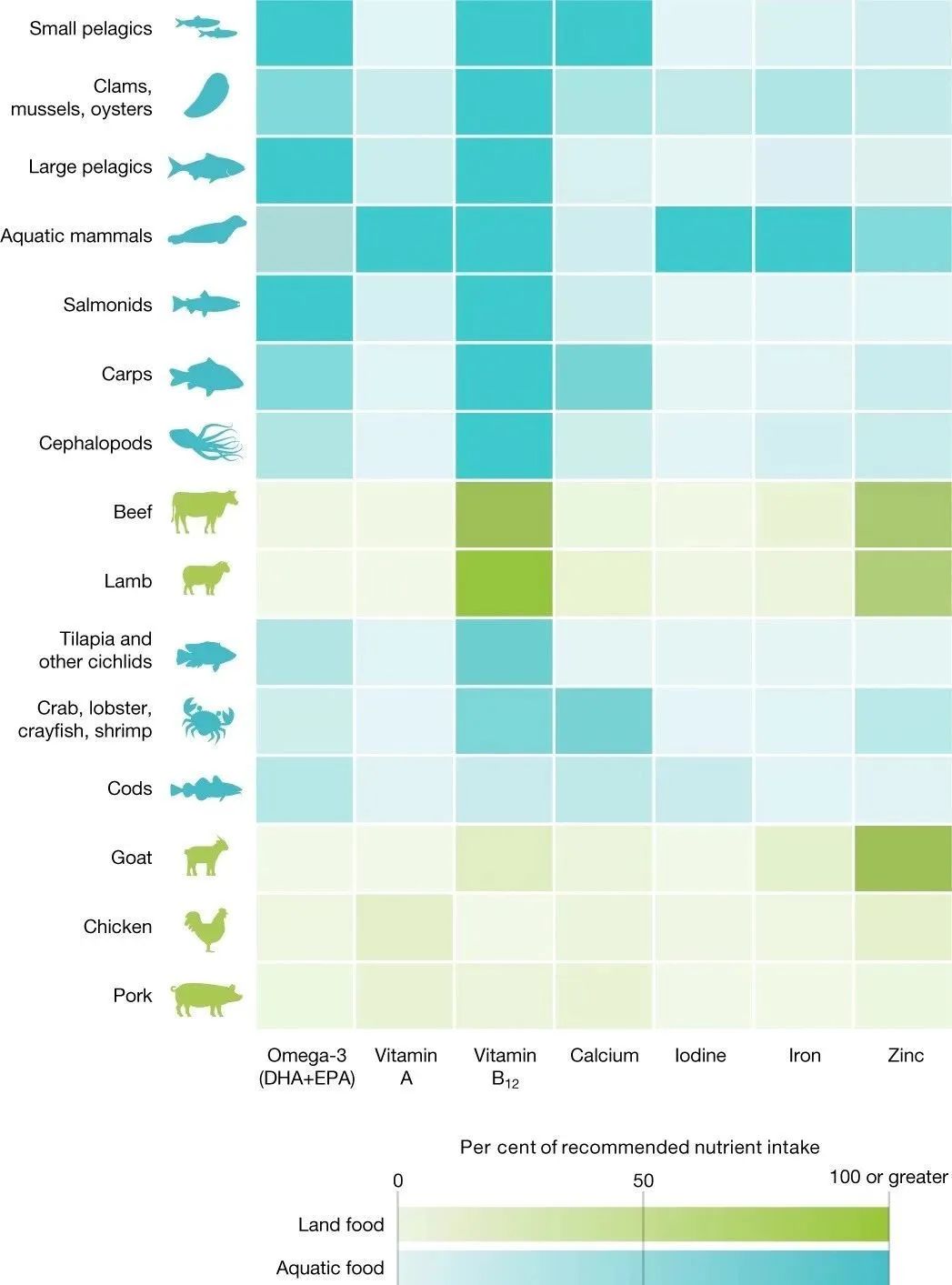 另外蓝色食品评估BFA[5]在一项研究中发现海洋蓝色食品在营养价值和可持续性收益潜力排名高于陆生动物源食品。[6]