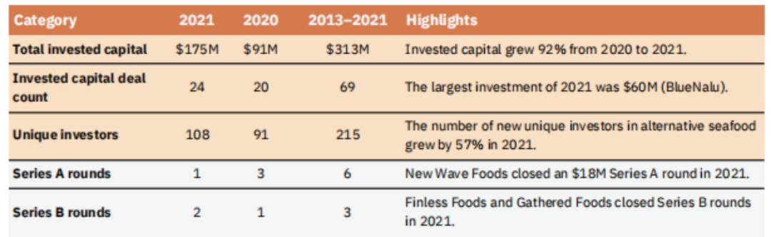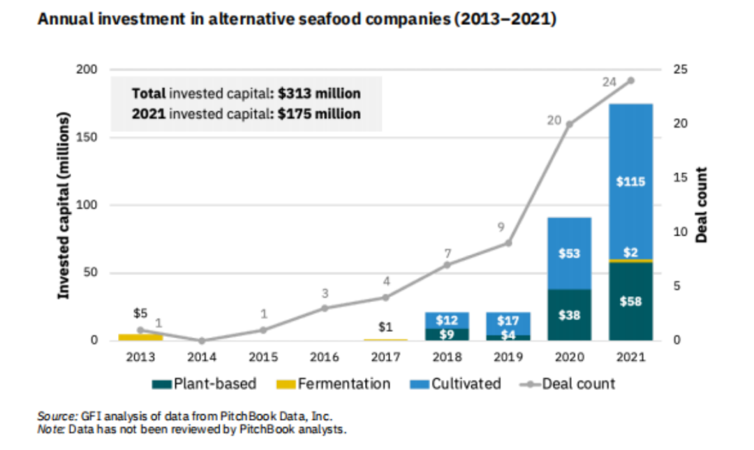 据好食品研究所(the Good Food Institute, GFI)统计,2021年全球替代海产品公司完成了15笔投融资项目,募集资金1.75亿美元,创历史新高。几乎是2020年融资额的两倍。[9]