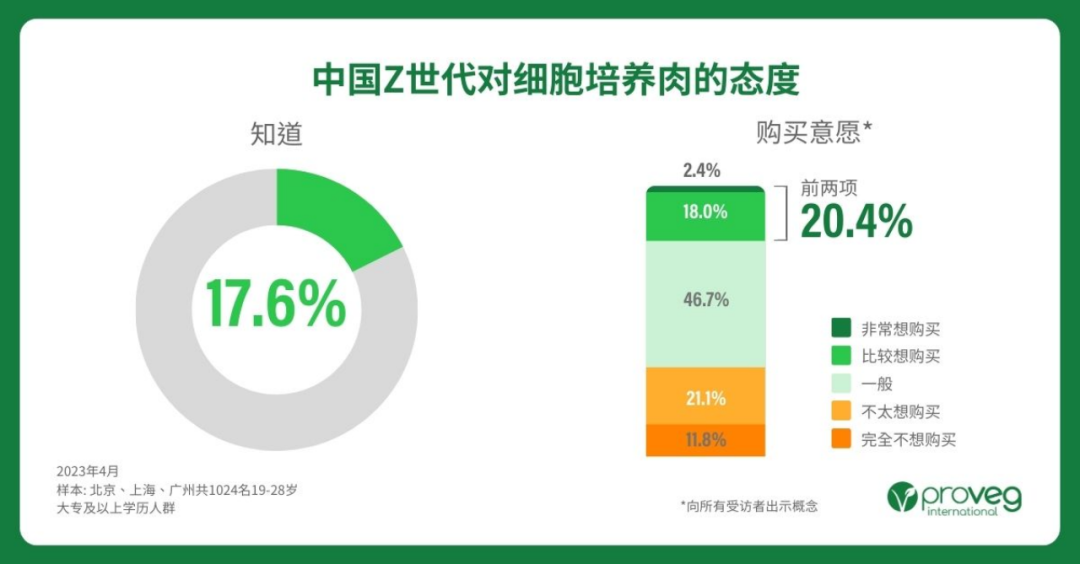 ProVeg于今年4月份针对1024名19-28岁大专以上学历的消费者进行调查,受限于国内目前没有细胞培养肉的产品推出市场,所以大众对细胞培养肉的认知还处于新兴阶段。调查对象中仅17.6%消费者知道细胞培养肉。[16]