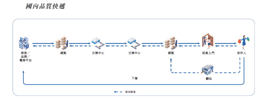 国内物流在服务模式上,分为国内供应链和品质快递业务两大类。其中,国内供应链是包含从揽收、仓储到分发的一体化供应链解决方案,主要面向行业大客户。而关于品质快递业务包含逆向物流服务(货退回商家)和品质快递服务。