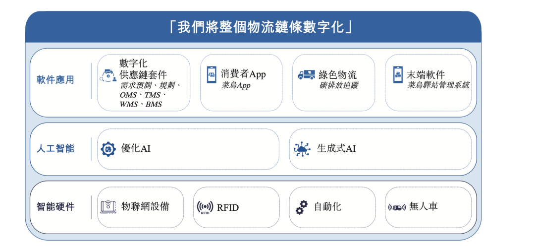 - 最上层的软件应用,既有综合的数字化供应链套件,也有面向菜鸟驿站的管理系统和消费者端App。其中,最有壁垒、未来也可能最有商业价值的是数字化供应链套件,支持智能数据驱动决策,例如需求预测及规划,管理来自中国及全球拥有大量SKU的众多商家的订单。
