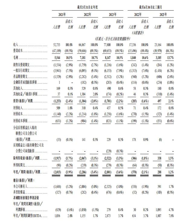 招股书显示,2021财年至2023财年(截至3月31日止年度),菜鸟的营收持续高速增长,其营收分别为527.33亿、668.67亿元、778亿元,复合年增长率为21%。截至今年6月30日的2024财年一季度,菜鸟营收231.64亿元,增长超33%。