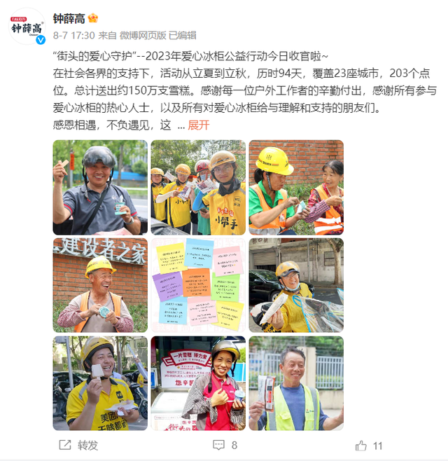 如今的钟薛高,除了与品牌联名,也讲起了热心公益、助农助贫助学的故事。与中国乡村发展基金会联名,用云南孟连的咖啡做雪糕;在北京、上海等城市的街头摆放“爱心冰柜”,给户外工作者提供免费雪糕;在高考考场外,分发雪糕给考生,恭喜“糕中”……