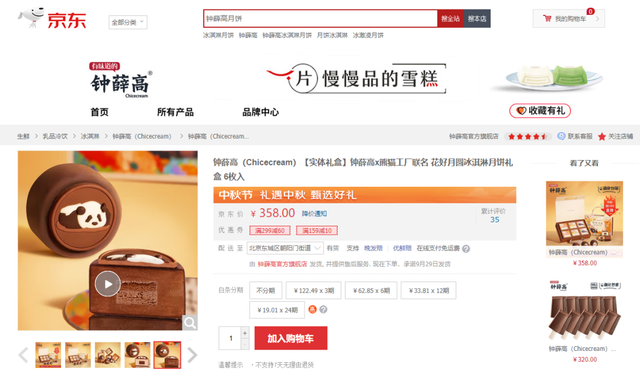 钟薛高此次推出的“花好月圆”月饼冰激凌礼盒,一盒六枚,有三种口味;主要在京东、淘宝、抖音等平台售卖。据电商平台显示,该款礼盒在钟薛高旗舰店券前价358元/盒;以此计算,平均单个月饼售价59.7元,按每个月饼净重62克计算,每克售价0.96元,高于大白兔冠生园联名月饼的0.73元/克,以及哈根达斯水井坊联名月饼的0.83元/克。