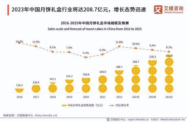市场方面,根据艾媒咨询数据显示,2015—2022年,我国月饼产量逐年增加,已从32.8万吨增至43.7万吨;月饼礼盒市场也在逐年攀升,预计到2025年中国月饼礼盒市场规模可达247亿元。