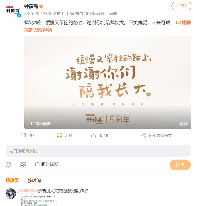 再次被打脸的现实,似乎让钟薛高坚定了“韬光养晦”的信念。在随后的公司5周年庆,钟薛高除了在旗舰店打折促销外,几乎没有做什么公开宣传。其在官方微博上默默上传了一条纪念视频,表白粉丝“缓慢又笨拙的路上,谢谢你们陪我长大”。可就是这段话,却引发王源粉丝的群嘲,被质疑是抄袭王源2018年演唱会时的宣传文案。该条微博评论区的一条条吐槽直到今天依然可见。
