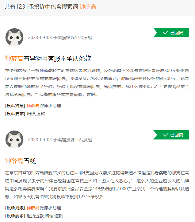 与此同时,关于钟薛高的各种“负面舆情”却还在不断出现:21家分公司被注销、产品频频出现在临期店、550万资产被法院冻结查封……更让人难堪的是,尽管林盛一再表示,所有新的消费品和新的消费模式“必须要以品质作为第一前提”,但是钟薛高被投诉吃出“异物”的报道却是此起彼伏;在黑猫投诉平台上,涉及钟薛高的投诉超过1200条。