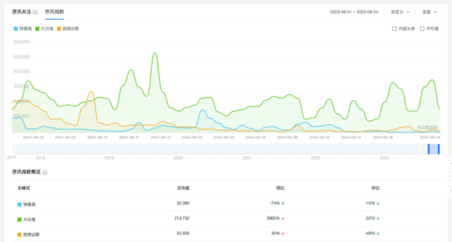 趣解商业查询百度指数发现,自8月以来,互联网上有关钟薛高的资讯持续走低,资讯指数日均值32380,与去年同期相比下降了74%。而同样有联名月饼推出的大白兔,资讯指数则达到了213752,较去年同期猛增了3900%;哈根达斯资讯指数52935,同比也增长了30%。